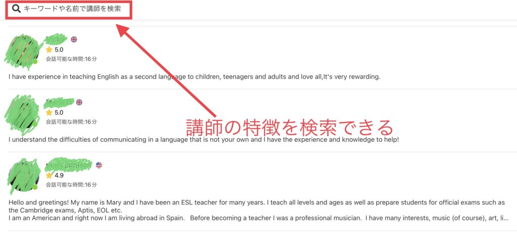 Camblyの講師検索の画面では講師の検索ができます。