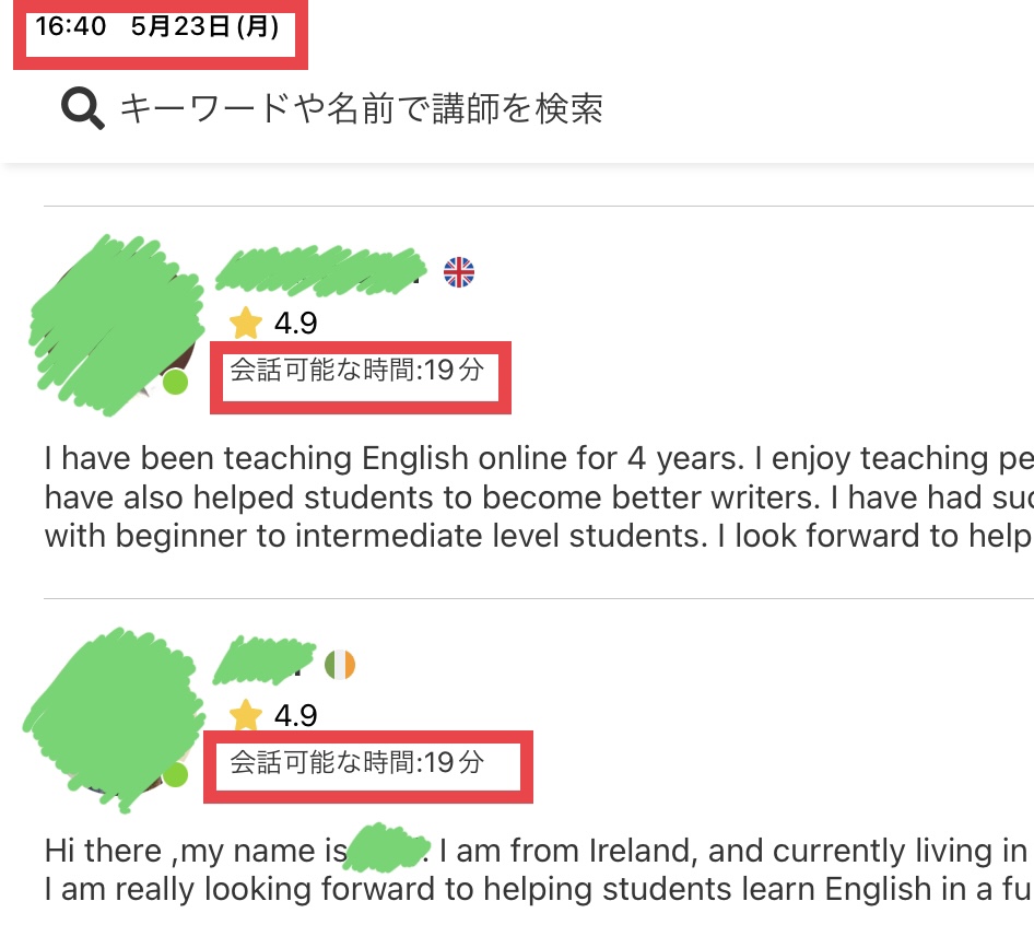 いつもどの講師にしようか迷っているうちに時間が過ぎてしまうので、実際には17:04とかに講師と繫って残り時間が25分しかないというようなこともあります。